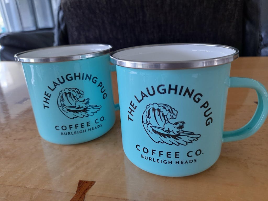 Finished with a sleek white enamel coat and branded with The Laughing Pug’s signature mark, it’s a functional keepsake your customers will reach for daily.